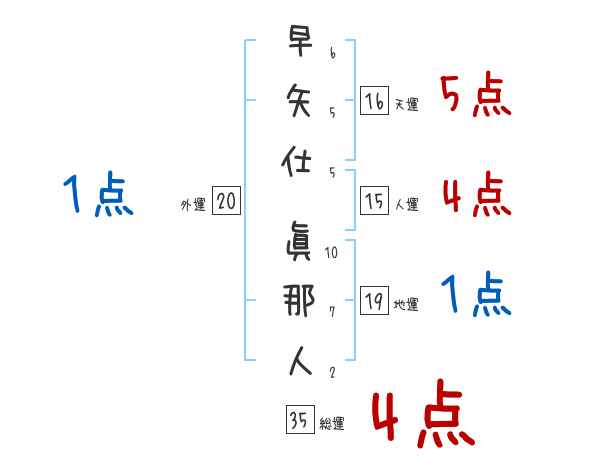 天運![]() | 早矢仕眞那人さんの天運は16画の5つ星!人望が厚く大きく発展する。逆転成功が見える。 家系が持つ宿命的な運勢を表します。祖先から受け継いだ苗字ですので自分の力が及びません。家柄を象徴します。 |