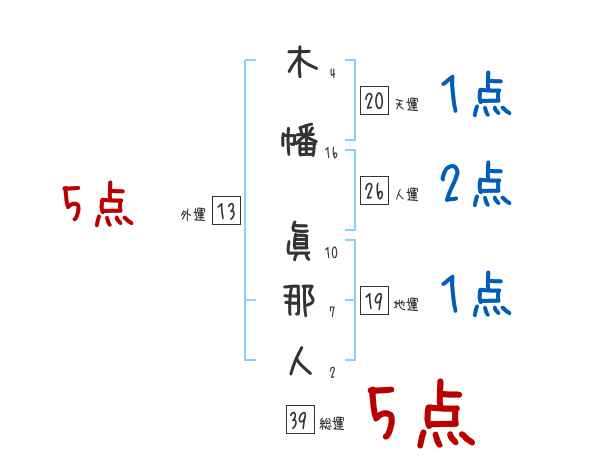 総運![]() | 木幡眞那人さんの総運は39画の5つ星!社交性に優れ人望が厚い。人の上に立ち成功する。 あなたの人生を表す1番重要な運勢です。生涯を通じて影響する総合運となり、主に50歳以降の晩年期に影響を及ぼします。 |