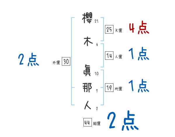 総運![]() | 櫻木眞那人さんの総運は44画の2つ星!誠実で慎重な性格。物事を考えすぎないように注意しましょう。 あなたの人生を表す1番重要な運勢です。生涯を通じて影響する総合運となり、主に50歳以降の晩年期に影響を及ぼします。 |