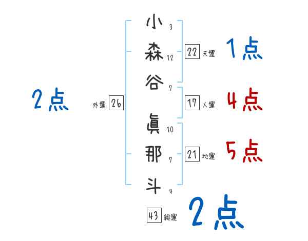 総運![]() | 小森谷眞那斗さんの総運は43画の2つ星!頑固な性格で独立心が強いかも。やや非現実的で浪費に注意しましょう。 あなたの人生を表す1番重要な運勢です。生涯を通じて影響する総合運となり、主に50歳以降の晩年期に影響を及ぼします。 |