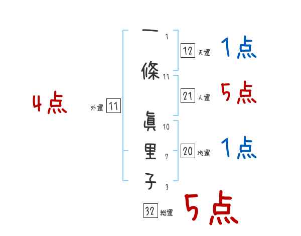 | 外運  | 一條眞里子さんの外運は11画の4つ星!着実に富や地位を得る幸運な人生。生活面を象徴する運勢です。外部から受ける影響力を表し、結婚運、家庭運や職場、環境への順応性を表します。 |