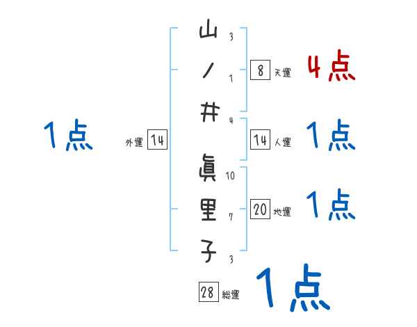 総運![]() | 山ノ井眞里子さんの総運は28画の1つ星!家庭環境に注意。スポーツで活躍できる能力があるかも。 あなたの人生を表す1番重要な運勢です。生涯を通じて影響する総合運となり、主に50歳以降の晩年期に影響を及ぼします。 |