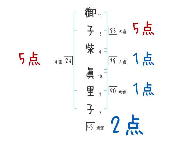 外運![]() | 御子柴眞里子さんの外運は24画の5つ星!家庭運が良く順調な人生。金運にも恵まれる。 生活面を象徴する運勢です。外部から受ける影響力を表し、結婚運、家庭運や職場、環境への順応性を表します。 |