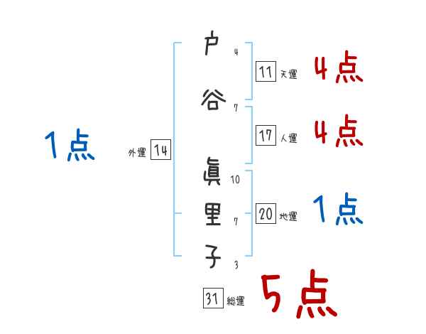 | 天運  | 戸谷眞里子さんの天運は11画の4つ星!着実に富や地位を得る幸運な人生。家系が持つ宿命的な運勢を表します。祖先から受け継いだ苗字ですので自分の力が及びません。家柄を象徴します。 |