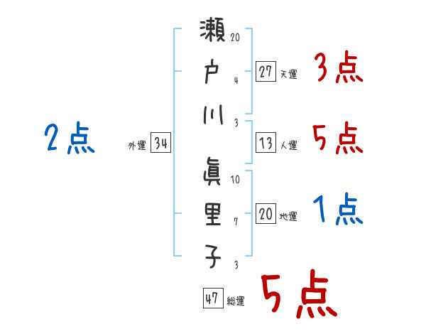 天運![]() | 瀬戸川眞里子さんの天運は27画の3つ星!頭脳明晰だが強情で摩擦が多い傾向。孤立に注意。 家系が持つ宿命的な運勢を表します。祖先から受け継いだ苗字ですので自分の力が及びません。家柄を象徴します。 |