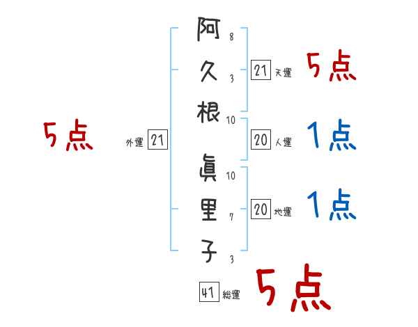 天運![]() | 阿久根眞里子さんの天運は21画の5つ星!統率力がある。独立し成功する。名誉を手に入れる。 家系が持つ宿命的な運勢を表します。祖先から受け継いだ苗字ですので自分の力が及びません。家柄を象徴します。 |