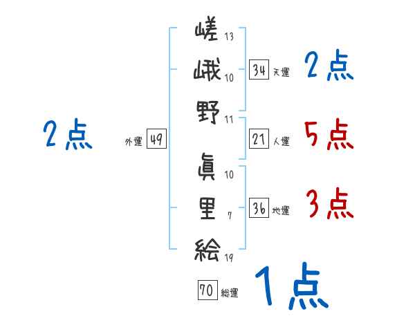 天運![]() | 嵯峨野眞里絵さんの天運は34画の2つ星!独創性に優れるが、自尊心が強く災難に注意しましょう。 家系が持つ宿命的な運勢を表します。祖先から受け継いだ苗字ですので自分の力が及びません。家柄を象徴します。 |