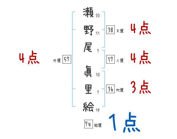 外運![]() | 瀬野尾眞里絵さんの外運は57画の4つ星!向上心があり人望がある。地位を得る。 生活面を象徴する運勢です。外部から受ける影響力を表し、結婚運、家庭運や職場、環境への順応性を表します。 |