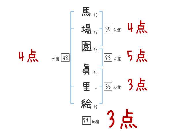 人運![]() | 馬場園眞里絵さんの人運は23画の5つ星!想像力に優れ活力がある。一代で成功し名誉を手に入れる。 性格や才能などを表す2番目に重要な運勢です。人間関係や協調性、社会的な成功に影響します。主に20歳から50歳ぐらいまでの中年期の運勢を表します。 |
