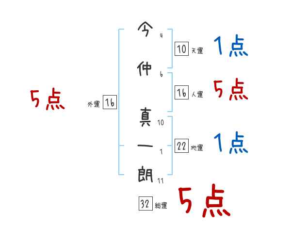 人運![]() | 今仲真一朗さんの人運は16画の5つ星!人望が厚く大きく発展する。逆転成功が見える。 性格や才能などを表す2番目に重要な運勢です。人間関係や協調性、社会的な成功に影響します。主に20歳から50歳ぐらいまでの中年期の運勢を表します。 |