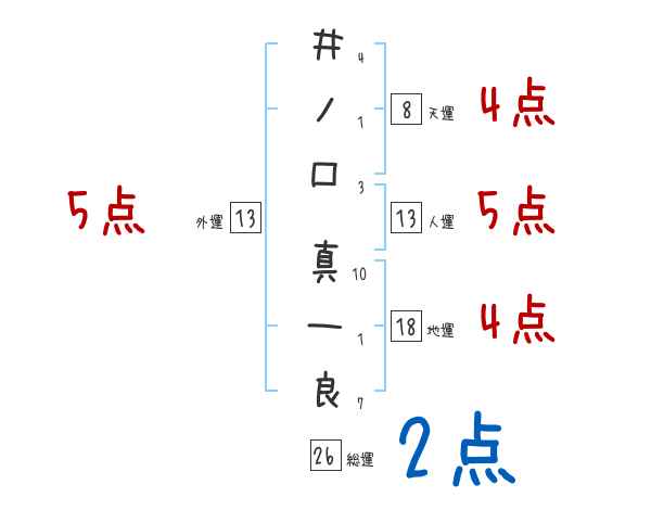 天運![]() | 井ノ口真一良さんの天運は8画の4つ星!勤勉家。根気強く努力し成功する。忍耐力がある。 家系が持つ宿命的な運勢を表します。祖先から受け継いだ苗字ですので自分の力が及びません。家柄を象徴します。 |