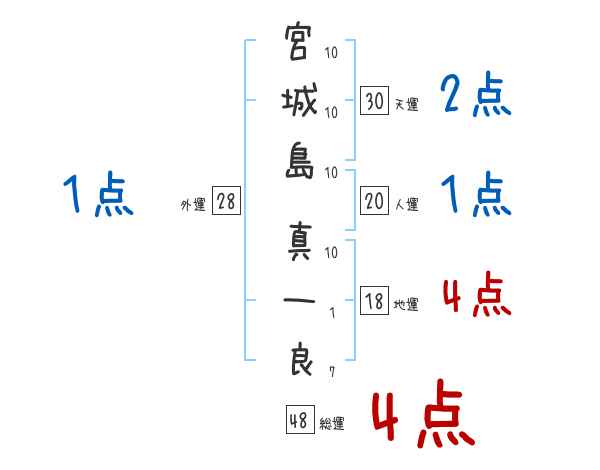天運![]() | 宮城島真一良さんの天運は30画の2つ星!浮き沈みの激しさに注意しましょう。 家系が持つ宿命的な運勢を表します。祖先から受け継いだ苗字ですので自分の力が及びません。家柄を象徴します。 |