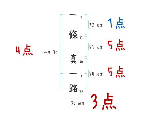 天運![]() | 一條真一路さんの天運は12画の1つ星!簡単な失敗で諦めてしまいやすいかも。着実に行動すると良いでしょう。 家系が持つ宿命的な運勢を表します。祖先から受け継いだ苗字ですので自分の力が及びません。家柄を象徴します。 |