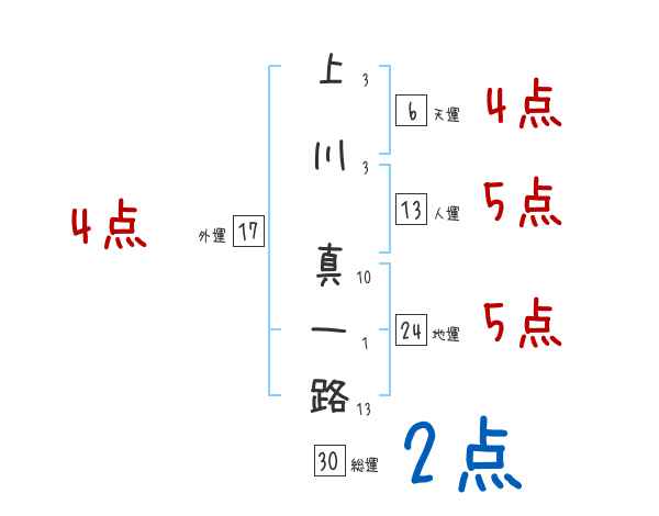 | 外運  | 上川真一路さんの外運は17画の4つ星!積極的な行動力。地位を気づき財産を手に入れる。純粋な心と直感力。生活面を象徴する運勢です。外部から受ける影響力を表し、結婚運、家庭運や職場、環境への順応性を表します。 |