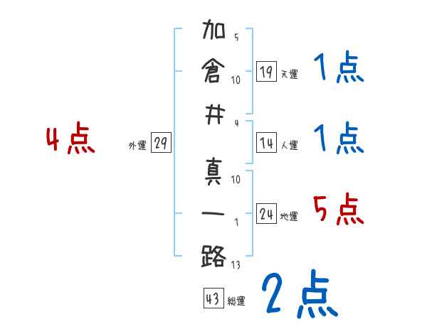 総運![]() | 加倉井真一路さんの総運は43画の2つ星!頑固な性格で独立心が強いかも。やや非現実的で浪費に注意しましょう。 あなたの人生を表す1番重要な運勢です。生涯を通じて影響する総合運となり、主に50歳以降の晩年期に影響を及ぼします。 |