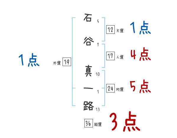 外運![]() | 石谷真一路さんの外運は19画の1つ星!優れた才能を持ちますが、協調性が足りないことも。周りの人と協力する事を意識しましょう。 生活面を象徴する運勢です。外部から受ける影響力を表し、結婚運、家庭運や職場、環境への順応性を表します。 |