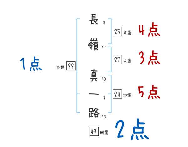 天運![]() | 長嶺真一路さんの天運は25画の4つ星!個性があり才能があふれる。強運の持ち主で発展する。 家系が持つ宿命的な運勢を表します。祖先から受け継いだ苗字ですので自分の力が及びません。家柄を象徴します。 |