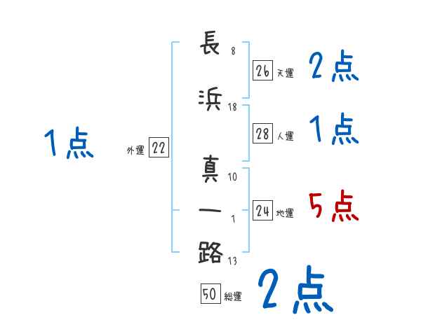 | 外運  | 長浜真一路さんの外運は22画の1つ星!努力することが苦手ないっぽう手先が器用。芸術性にも優れる。生活面を象徴する運勢です。外部から受ける影響力を表し、結婚運、家庭運や職場、環境への順応性を表します。 |