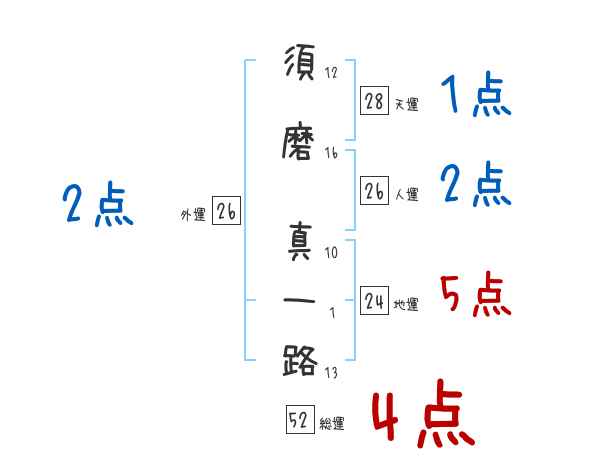 天運![]() | 須磨真一路さんの天運は28画の1つ星!家庭環境に注意。スポーツで活躍できる能力があるかも。 家系が持つ宿命的な運勢を表します。祖先から受け継いだ苗字ですので自分の力が及びません。家柄を象徴します。 |