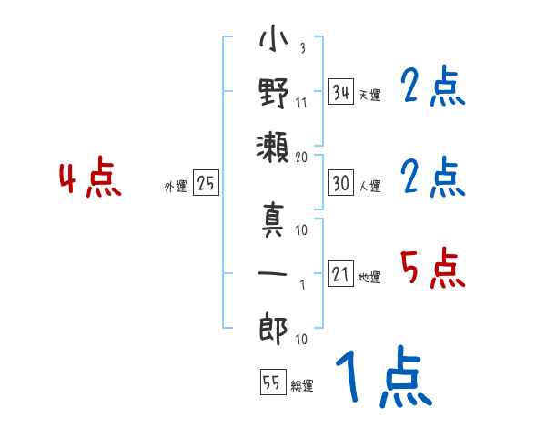 天運![]() | 小野瀬真一郎さんの天運は34画の2つ星!独創性に優れるが、自尊心が強く災難に注意しましょう。 家系が持つ宿命的な運勢を表します。祖先から受け継いだ苗字ですので自分の力が及びません。家柄を象徴します。 |