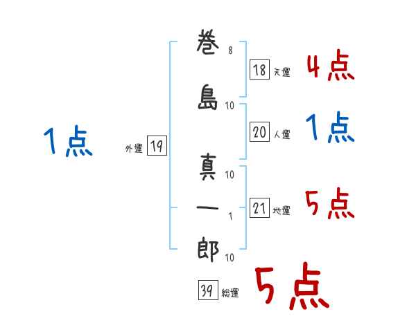 外運![]() | 巻島真一郎さんの外運は19画の1つ星!優れた才能を持ちますが、協調性が足りないことも。周りの人と協力する事を意識しましょう。 生活面を象徴する運勢です。外部から受ける影響力を表し、結婚運、家庭運や職場、環境への順応性を表します。 |