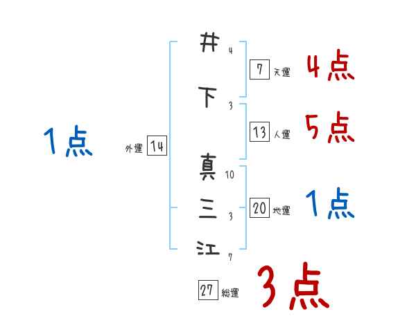 外運![]() | 井下真三江さんの外運は14画の1つ星!人に対して優しいがストレスを溜め込みがち。人間関係のトラブルを避けるよう気をつけましょう。 生活面を象徴する運勢です。外部から受ける影響力を表し、結婚運、家庭運や職場、環境への順応性を表します。 |