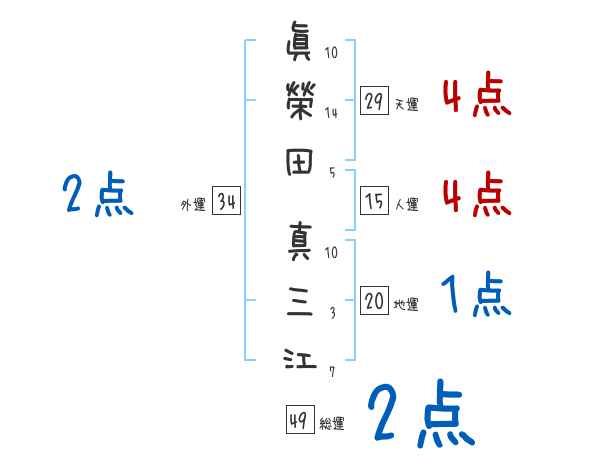 外運![]() | 眞榮田真三江さんの外運は34画の2つ星!独創性に優れるが、自尊心が強く災難に注意しましょう。 生活面を象徴する運勢です。外部から受ける影響力を表し、結婚運、家庭運や職場、環境への順応性を表します。 |