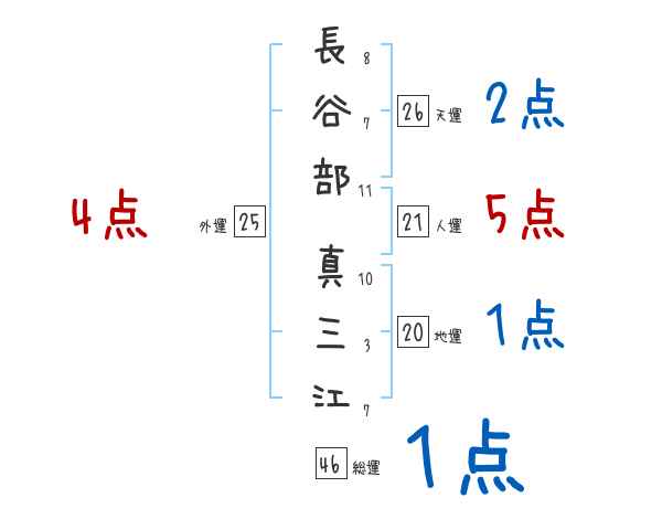 天運![]() | 長谷部真三江さんの天運は26画の2つ星!波瀾万丈かも。信頼できる人を大事にしましょう。 家系が持つ宿命的な運勢を表します。祖先から受け継いだ苗字ですので自分の力が及びません。家柄を象徴します。 |