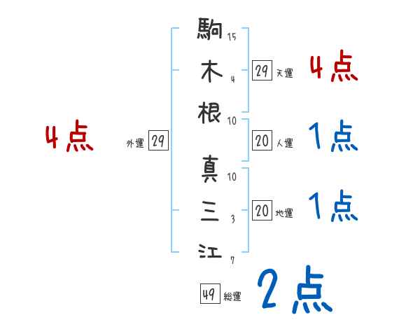 天運![]() | 駒木根真三江さんの天運は29画の4つ星!完全主義で才能がある。厳格な心の持ち主。 家系が持つ宿命的な運勢を表します。祖先から受け継いだ苗字ですので自分の力が及びません。家柄を象徴します。 |