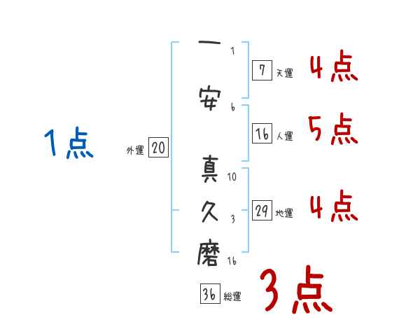 人運![]() | 一安真久磨さんの人運は16画の5つ星!人望が厚く大きく発展する。逆転成功が見える。 性格や才能などを表す2番目に重要な運勢です。人間関係や協調性、社会的な成功に影響します。主に20歳から50歳ぐらいまでの中年期の運勢を表します。 |
