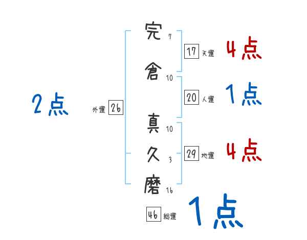 天運![]() | 完倉真久磨さんの天運は17画の4つ星!積極的な行動力。地位を気づき財産を手に入れる。純粋な心と直感力。 家系が持つ宿命的な運勢を表します。祖先から受け継いだ苗字ですので自分の力が及びません。家柄を象徴します。 |