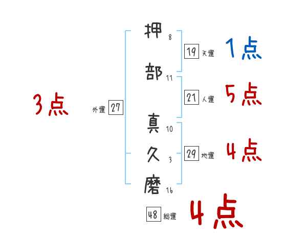 天運![]() | 押部真久磨さんの天運は19画の1つ星!優れた才能を持ちますが、協調性が足りないことも。周りの人と協力する事を意識しましょう。 家系が持つ宿命的な運勢を表します。祖先から受け継いだ苗字ですので自分の力が及びません。家柄を象徴します。 |