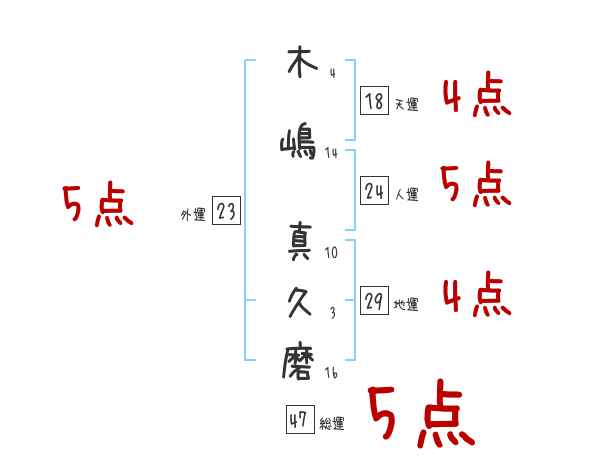 天運![]() | 木嶋真久磨さんの天運は18画の4つ星!情熱的で剛気。忍耐力があり信頼される。 家系が持つ宿命的な運勢を表します。祖先から受け継いだ苗字ですので自分の力が及びません。家柄を象徴します。 |