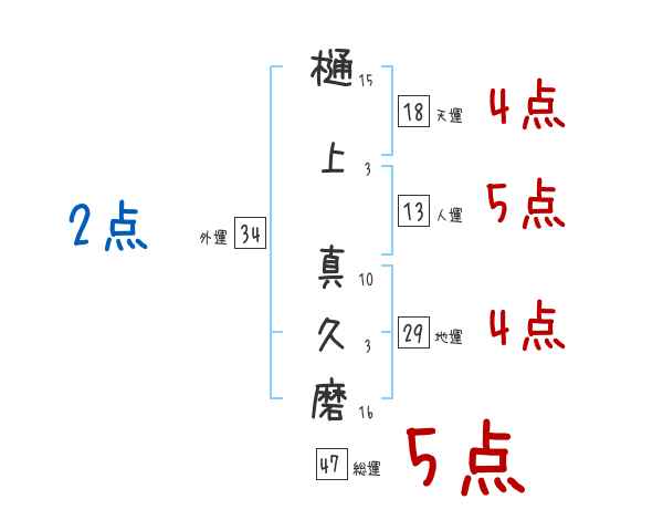 天運![]() | 樋上真久磨さんの天運は18画の4つ星!情熱的で剛気。忍耐力があり信頼される。 家系が持つ宿命的な運勢を表します。祖先から受け継いだ苗字ですので自分の力が及びません。家柄を象徴します。 |