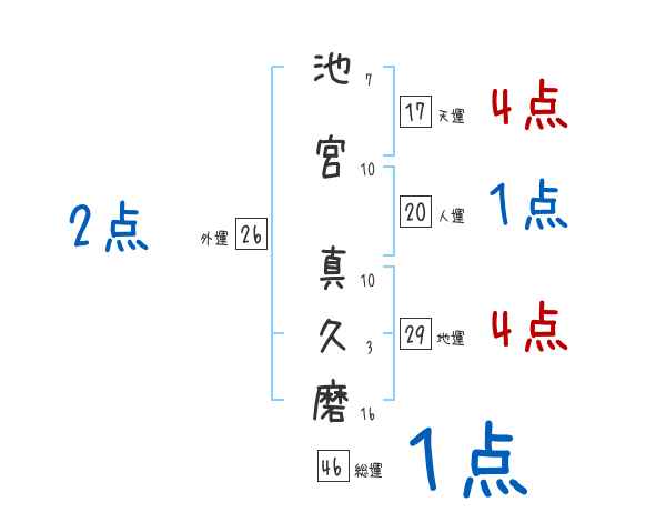 地運![]() | 池宮真久磨さんの地運は29画の4つ星!完全主義で才能がある。厳格な心の持ち主。 個性を表す基礎的な運勢です。性格形成や対人関係、行動力など家庭環境に影響されます。主に誕生してから20歳くらいまでの若年期の運勢を表します。 |