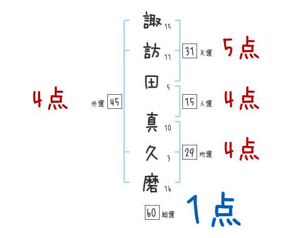 天運![]() | 諏訪田真久磨さんの天運は31画の5つ星!社交性があり判断力に優れる。順風満帆な人生で円満な生活。 家系が持つ宿命的な運勢を表します。祖先から受け継いだ苗字ですので自分の力が及びません。家柄を象徴します。 |