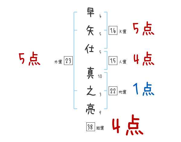 天運![]() | 早矢仕真之亮さんの天運は16画の5つ星!人望が厚く大きく発展する。逆転成功が見える。 家系が持つ宿命的な運勢を表します。祖先から受け継いだ苗字ですので自分の力が及びません。家柄を象徴します。 |