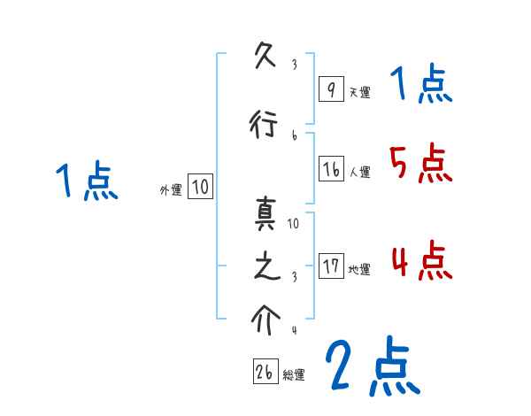 天運![]() | 久行真之介さんの天運は9画の1つ星!消極的で才能を発揮することが苦手なことも。周りの意見に耳を傾けましょう。 家系が持つ宿命的な運勢を表します。祖先から受け継いだ苗字ですので自分の力が及びません。家柄を象徴します。 |