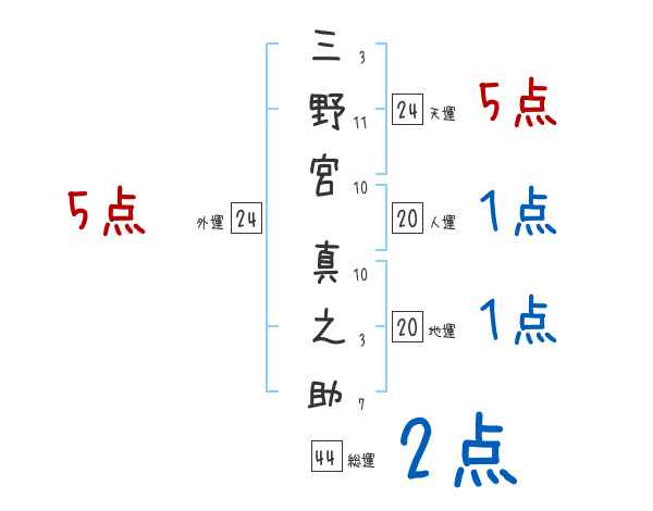 天運![]() | 三野宮真之助さんの天運は24画の5つ星!家庭運が良く順調な人生。金運にも恵まれる。 家系が持つ宿命的な運勢を表します。祖先から受け継いだ苗字ですので自分の力が及びません。家柄を象徴します。 |