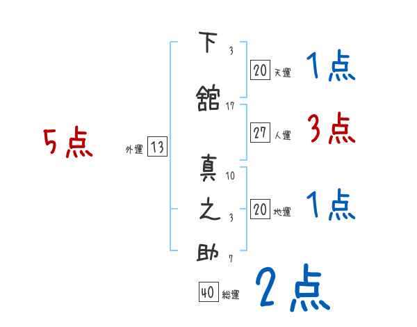 天運![]() | 下舘真之助さんの天運は20画の1つ星!社交が苦手。人とは違った才能があり波乱万丈な人生かも。 家系が持つ宿命的な運勢を表します。祖先から受け継いだ苗字ですので自分の力が及びません。家柄を象徴します。 |
