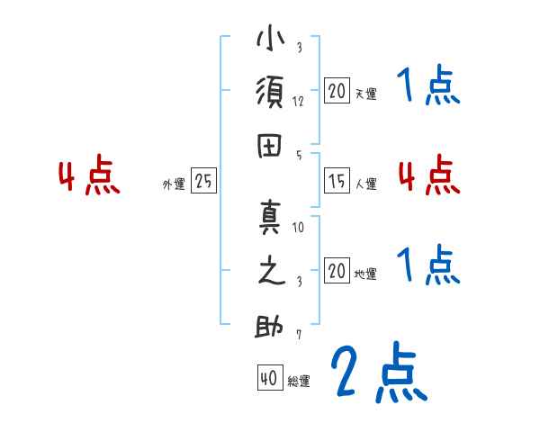 総運![]() | 小須田真之助さんの総運は40画の2つ星!自信過剰で物事に固執するためトラブルに注意。 あなたの人生を表す1番重要な運勢です。生涯を通じて影響する総合運となり、主に50歳以降の晩年期に影響を及ぼします。 |