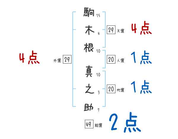 天運![]() | 駒木根真之助さんの天運は29画の4つ星!完全主義で才能がある。厳格な心の持ち主。 家系が持つ宿命的な運勢を表します。祖先から受け継いだ苗字ですので自分の力が及びません。家柄を象徴します。 |