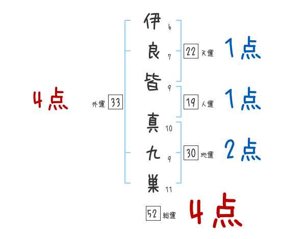 外運![]() | 伊良皆真九巣さんの外運は33画の4つ星!権力志向でプライドが高い。勇気があり運を切り開き成功する。 生活面を象徴する運勢です。外部から受ける影響力を表し、結婚運、家庭運や職場、環境への順応性を表します。 |