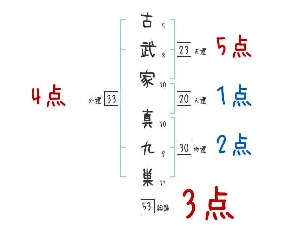 天運![]() | 古武家真九巣さんの天運は23画の5つ星!想像力に優れ活力がある。一代で成功し名誉を手に入れる。 家系が持つ宿命的な運勢を表します。祖先から受け継いだ苗字ですので自分の力が及びません。家柄を象徴します。 |