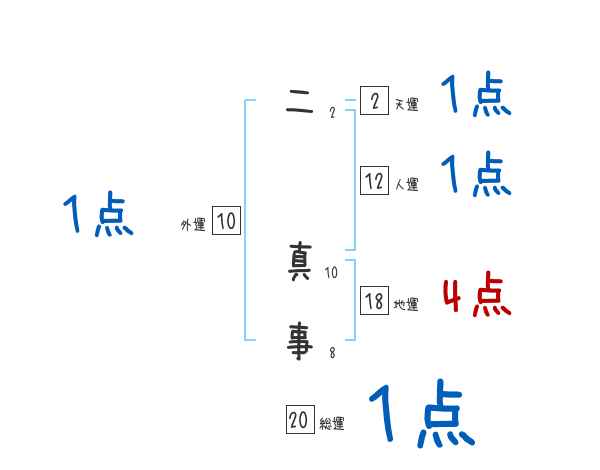 人運![]() | 二真事さんの人運は12画の1つ星!簡単な失敗で諦めてしまいやすいかも。着実に行動すると良いでしょう。 性格や才能などを表す2番目に重要な運勢です。人間関係や協調性、社会的な成功に影響します。主に20歳から50歳ぐらいまでの中年期の運勢を表します。 |