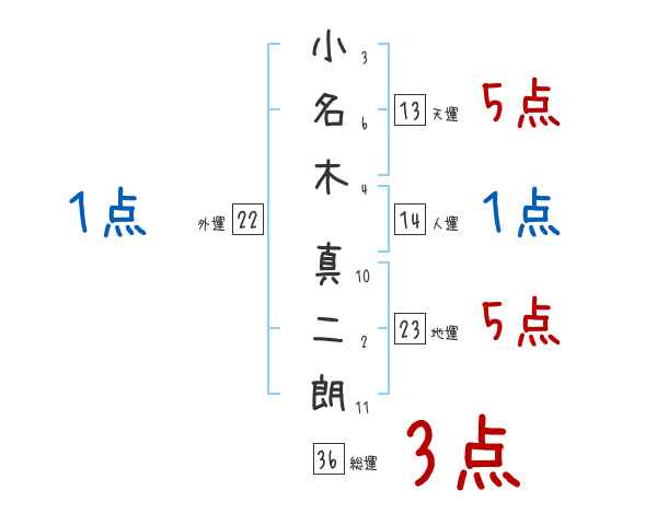総運![]() | 小名木真二朗さんの総運は36画の3つ星!先見性が豊かです。多少神経質で苦労することも。 あなたの人生を表す1番重要な運勢です。生涯を通じて影響する総合運となり、主に50歳以降の晩年期に影響を及ぼします。 |