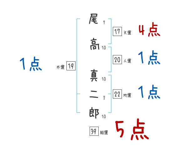 外運![]() | 尾高真二郎さんの外運は19画の1つ星!優れた才能を持ちますが、協調性が足りないことも。周りの人と協力する事を意識しましょう。 生活面を象徴する運勢です。外部から受ける影響力を表し、結婚運、家庭運や職場、環境への順応性を表します。 |