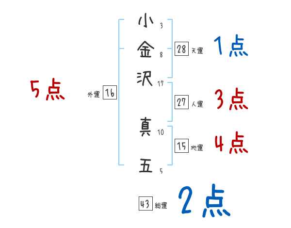 総運![]() | 小金沢真五さんの総運は43画の2つ星!頑固な性格で独立心が強いかも。やや非現実的で浪費に注意しましょう。 あなたの人生を表す1番重要な運勢です。生涯を通じて影響する総合運となり、主に50歳以降の晩年期に影響を及ぼします。 |