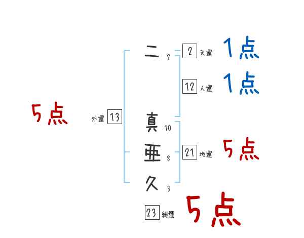 総運![]() | 二真亜久さんの総運は23画の5つ星!想像力に優れ活力がある。一代で成功し名誉を手に入れる。 あなたの人生を表す1番重要な運勢です。生涯を通じて影響する総合運となり、主に50歳以降の晩年期に影響を及ぼします。 |