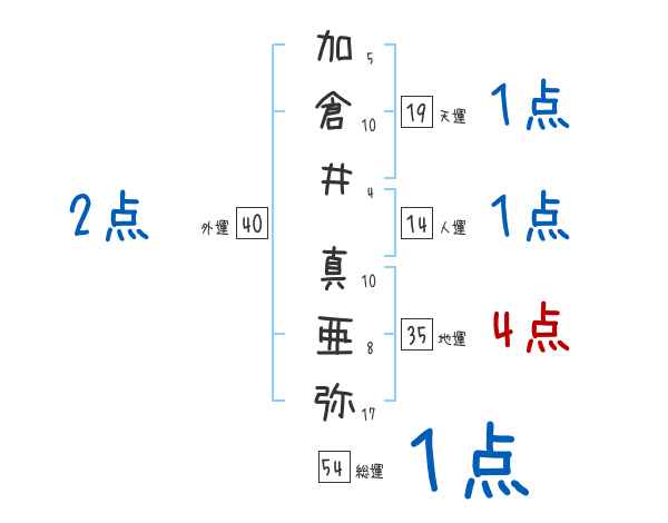 総運![]() | 加倉井真亜弥さんの総運は54画の1つ星!トラブルが多いかも。周りをよく見て協調して過ごしましょう。 あなたの人生を表す1番重要な運勢です。生涯を通じて影響する総合運となり、主に50歳以降の晩年期に影響を及ぼします。 |